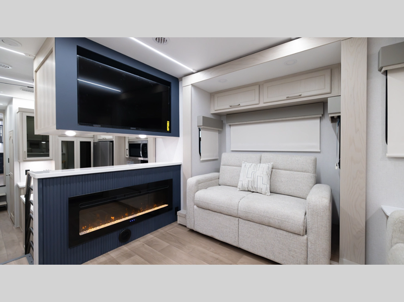Setting up is simple with the standard 6-point hydraulic leveling system, getting you settled in no time, and the slam latches on all storage doors paired with magnetic compartment holds make accessing your gear effortless. Outside, you'll also find a heated utility convenience center, 12V heat pads on all holding tanks for extended season camping, plus power awnings with LED lights. Inside, you are greeted with upgraded true solid surface countertops in both the kitchen and bath, soft close hidden-hinge reinforced doors and drawers with upgraded hardware, and dimmable ceiling strip lighting with three independent zones to set the perfect mood.
