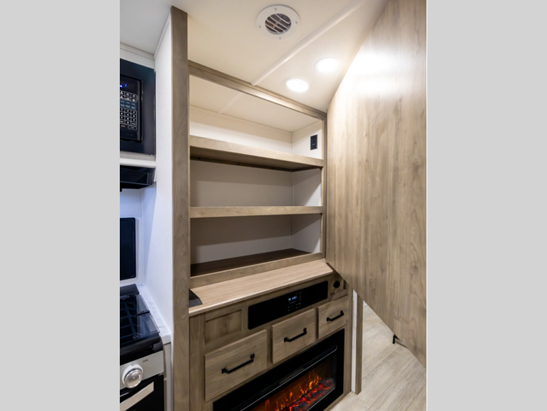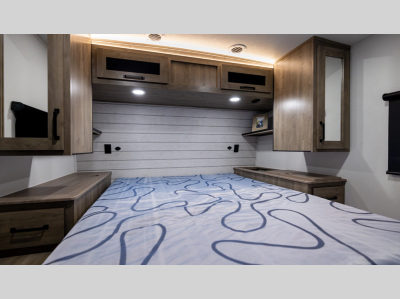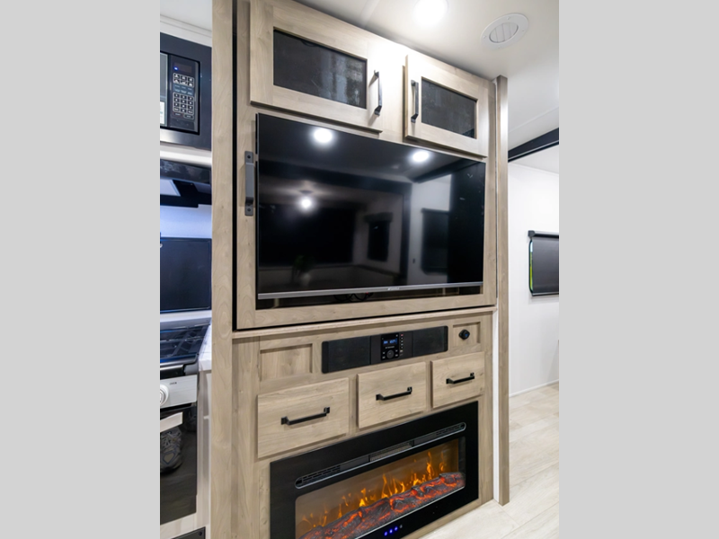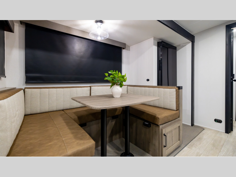 Each model is constructed with a fully enclosed and heated underbelly plus a fully laminated roof for added durability. There is also a power tongue jack outside, along with a power awning with LED lights, and slam latch baggage doors with magnets. Inside, you'll find roller shades, ball bearing drawer guides, USB ports, and more comforts and conveniences.