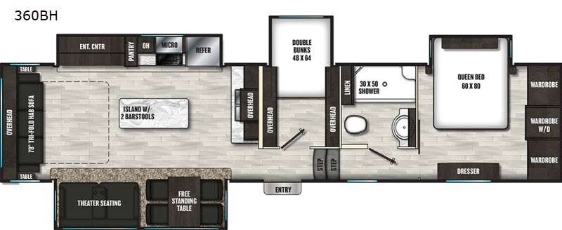 The whole family can join in on the fun with this motorhome thanks to the second bedroom with a set of 48" x 64" bunk beds slide! The front private bedroom has a queen bed slide, a dresser, and a front wall wardrobe that is prepped to add an optional washer and dryer to keep your clothes looking their best. The kitchen has plenty of countertop space for meal prep including an island with two barstools to enjoy your coffee at each morning. The rear living area is the place to go when you're ready to relax. It has a 78" tri-fold hide-a-bed sofa and theatre seating with heat and massage across from an entertainment center!